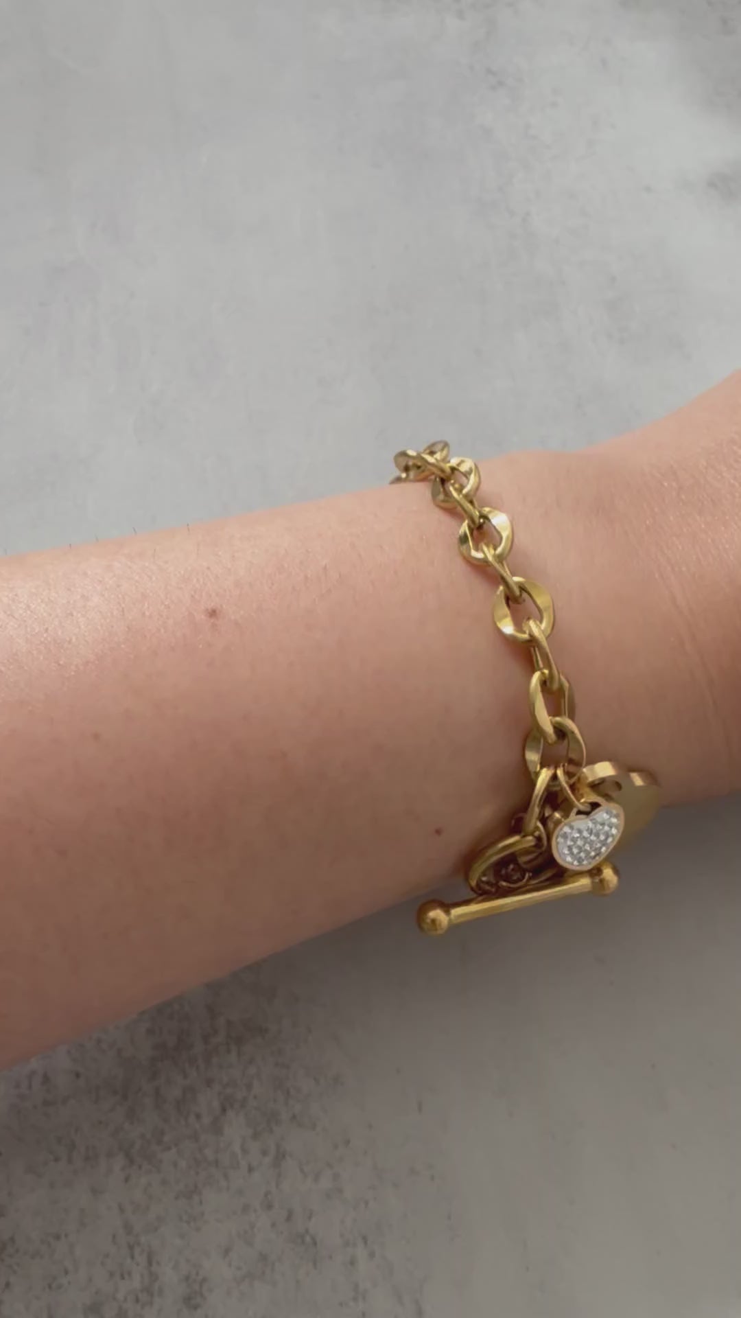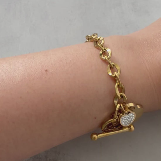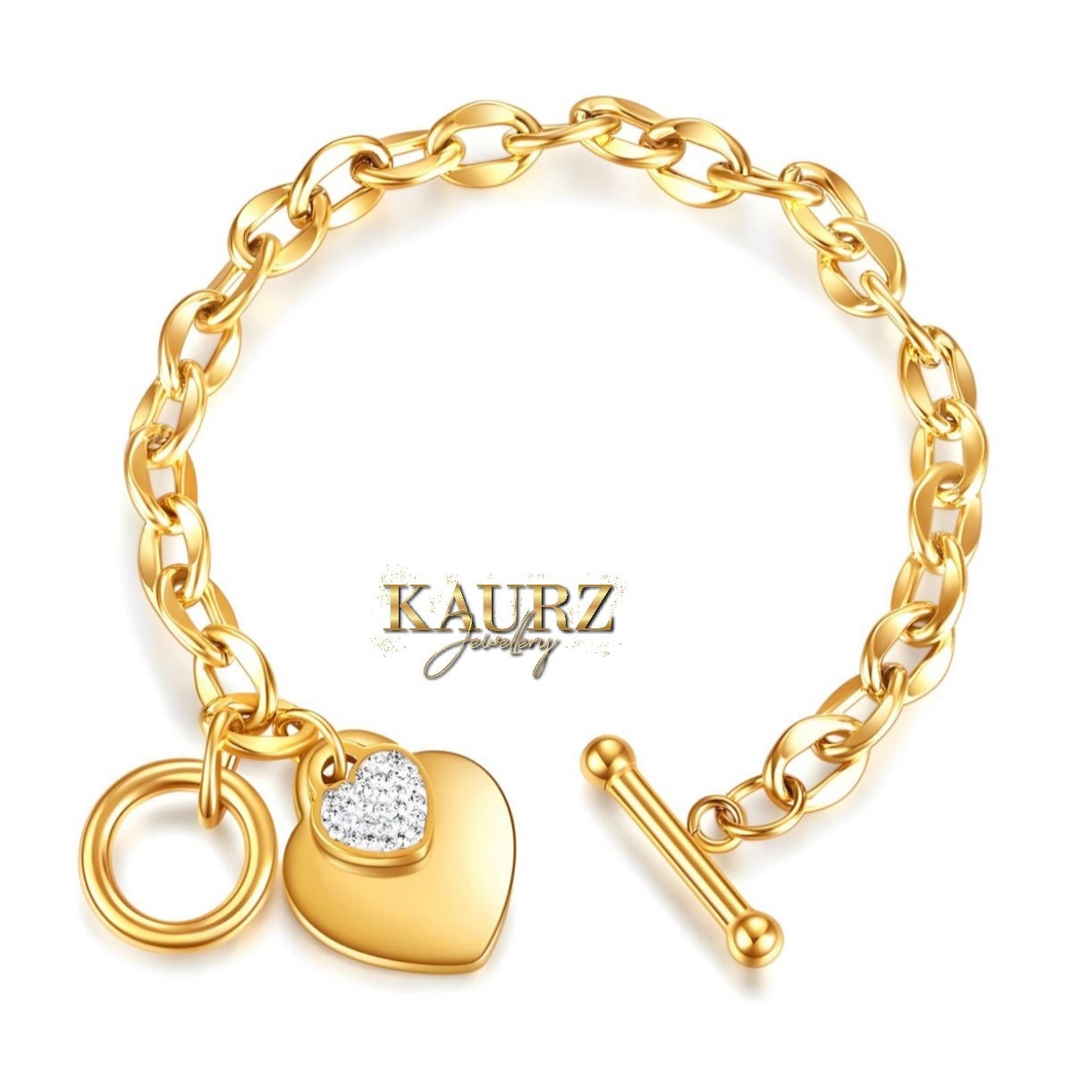 Add timeless elegance to your jewellery collection with this Gold Heart charm bracelet. Expertly crafted with a luxurious gold-tone finish, this bracelet features bold, high polish chain links and a classic toggle clasp for a secure wear. The centerpiece is a beautifully detailed heart charm, accented with shimmering cubic zirconia crystals that catch the light with every movement.
